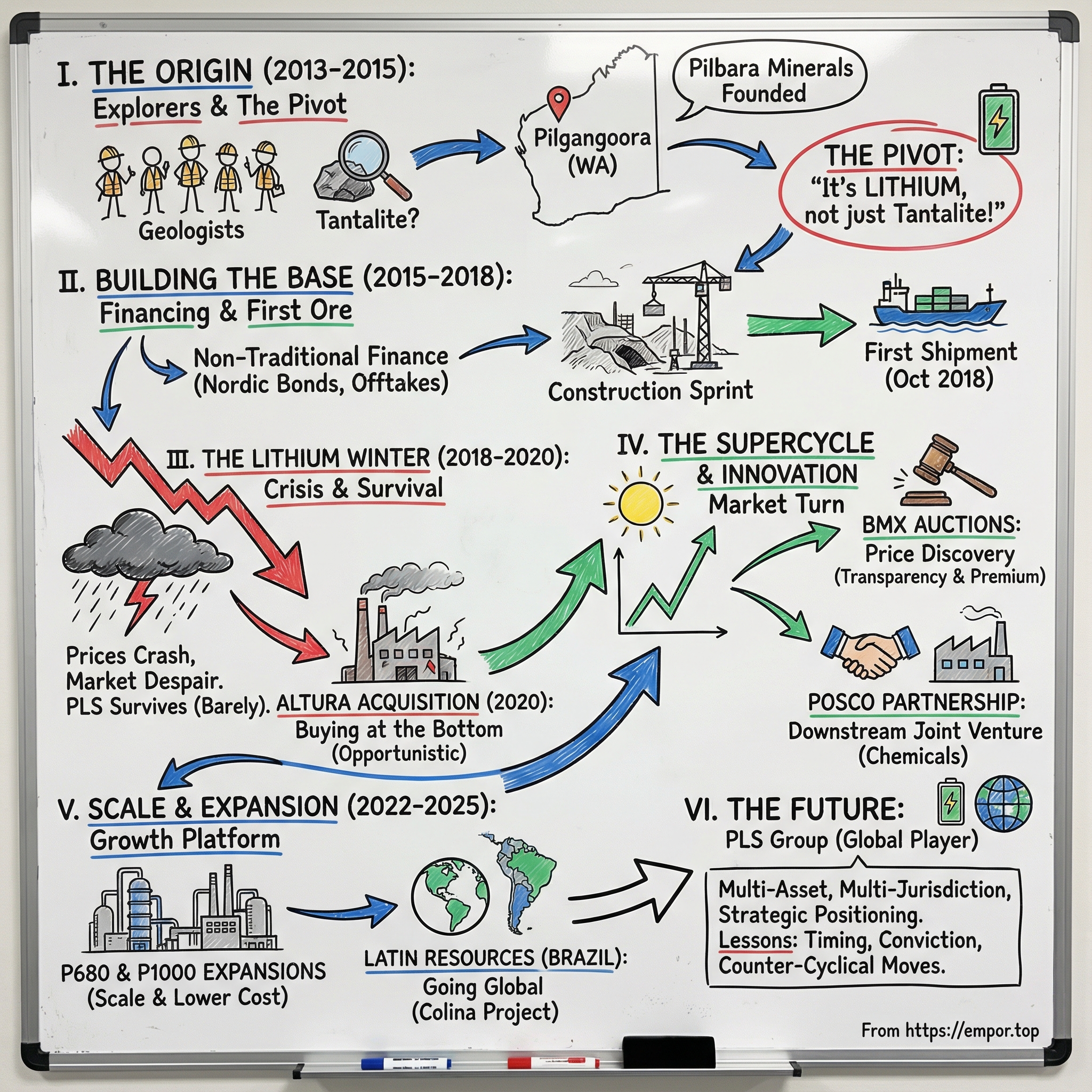 What started as a tantalite hunt became a lithium business because the founders and management team made a sequence of decisions that were hard in the moment and obvious only later. They financed Pilgangoora when Australia still shrugged at lithium. They kept the lights on through the lithium winter. They bought Altura when nobody wanted the asset. They created BMX to drag price discovery into the open. And they partnered with POSCO to get exposure to the chemical step without taking on all the risk alone.