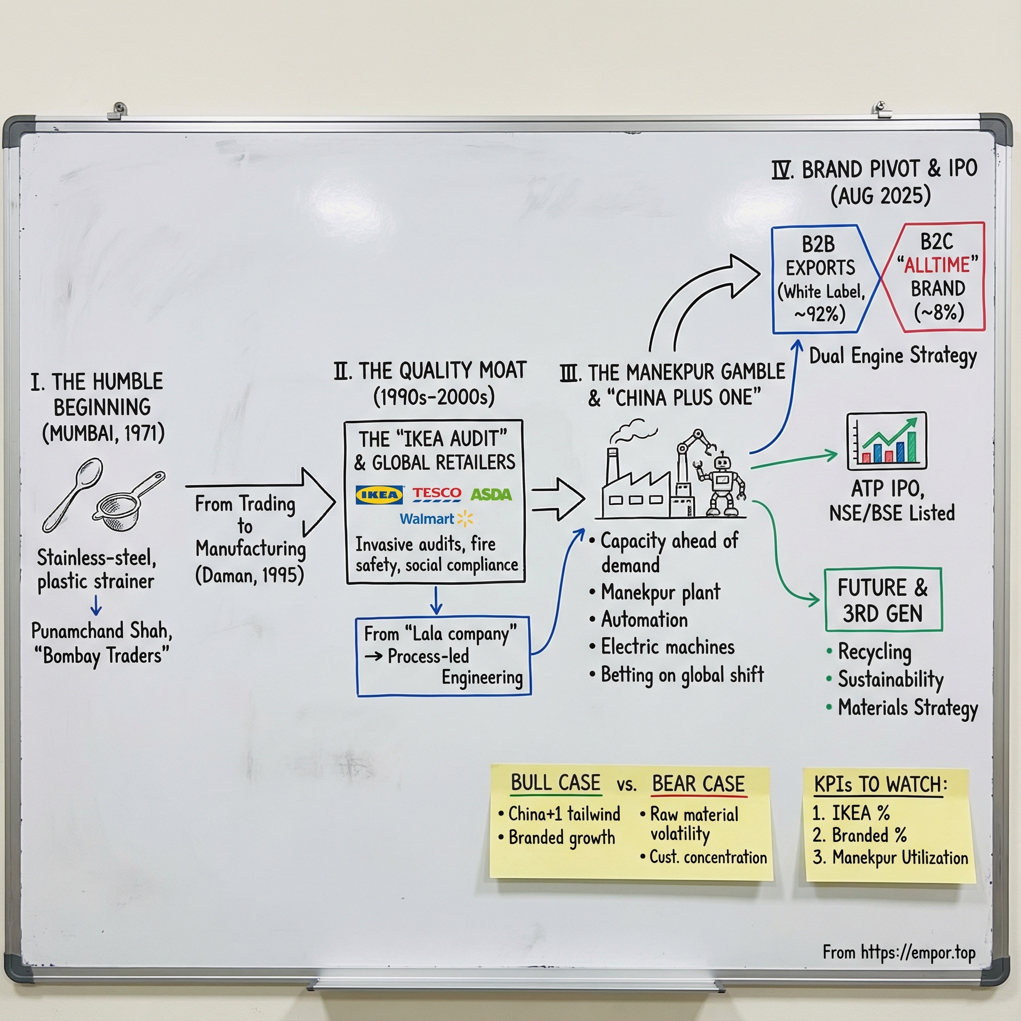 But the reason to study All Time isn’t just a clean listing pop. It’s what the company represents: a business that’s lived through three chapters of Indian manufacturing evolution—starting in the messy, unorganized era; then grinding through the brutal qualification process required to become a trusted global supplier; and now stepping into the hardest chapter of all—trying to build a consumer brand while riding India’s rising domestic consumption.