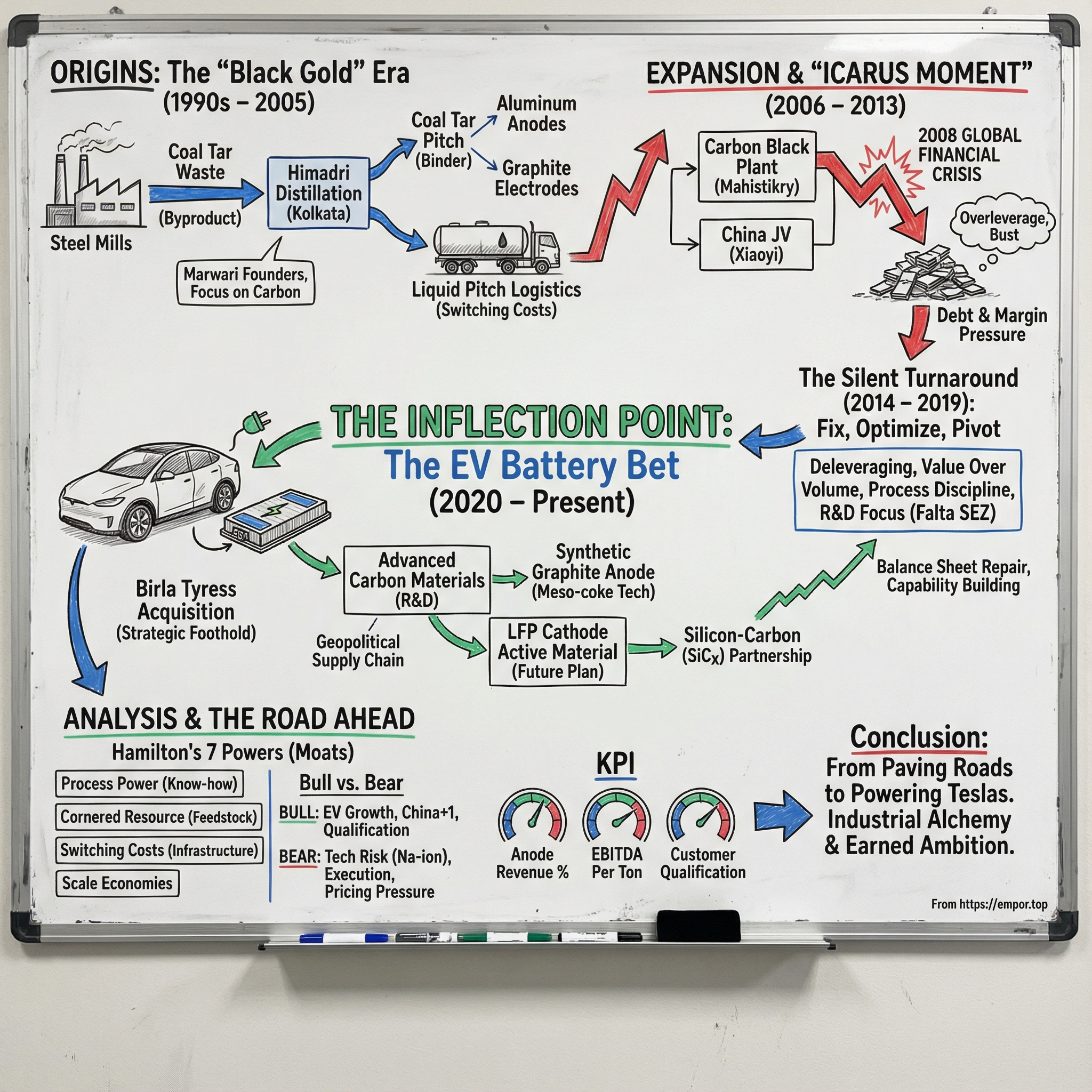 We’ll trace Himadri’s full arc: its beginnings in the early 1990s as a coal tar distillation business; the expansion years that nearly broke it during India’s crisis period; the quiet, disciplined turnaround; and then the big swing—building toward what it claims is end-to-end vertical integration from coal tar to finished anode material.