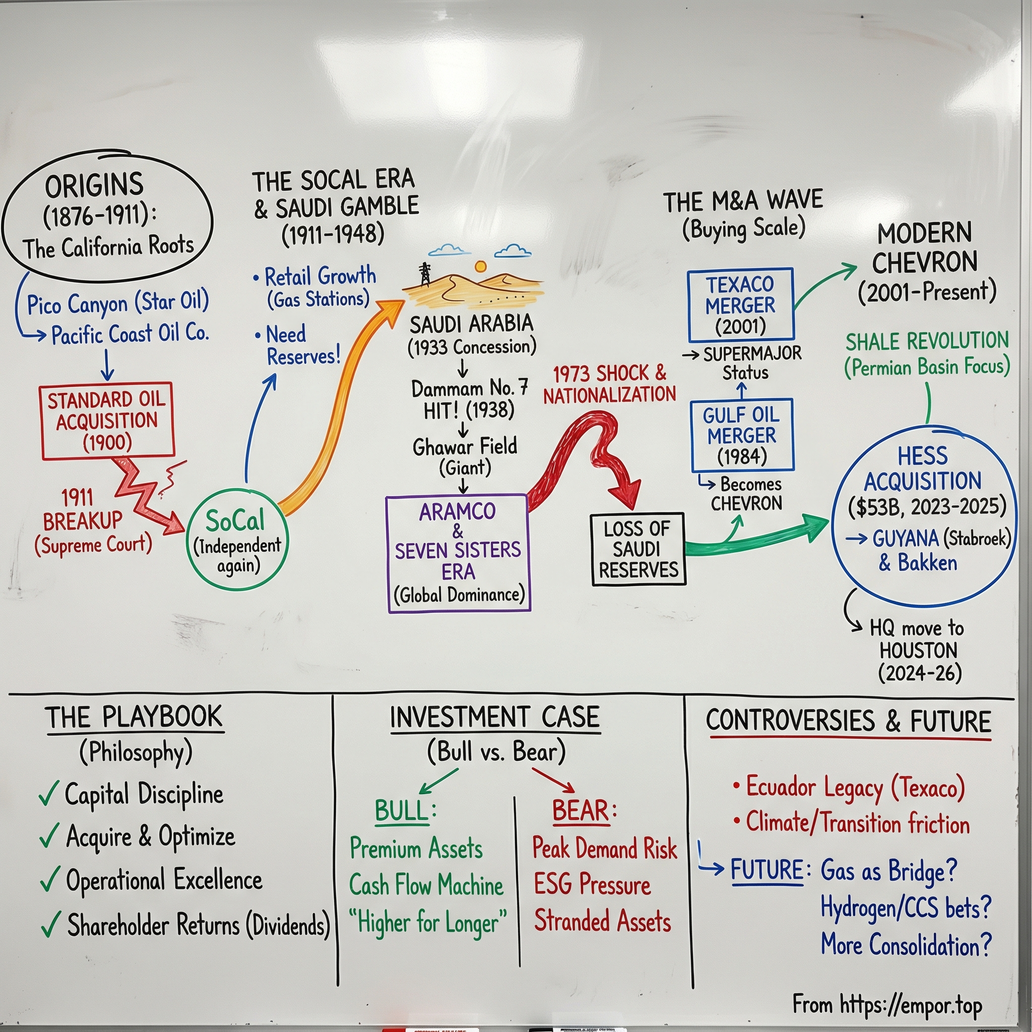 What’s undeniable is the arc. A company born from California wildcatters became a global operator spanning every inhabited continent, shaped by Standard Oil’s breakup, Saudi Arabia’s rise, OPEC’s leverage, and shale’s resurgence. Chevron has never been static; it has been re-formed again and again by the world around it. Whatever the energy system becomes next, the record suggests Chevron will try to do what it has always done: adapt, scale, and place bets meant to pay off over decades.