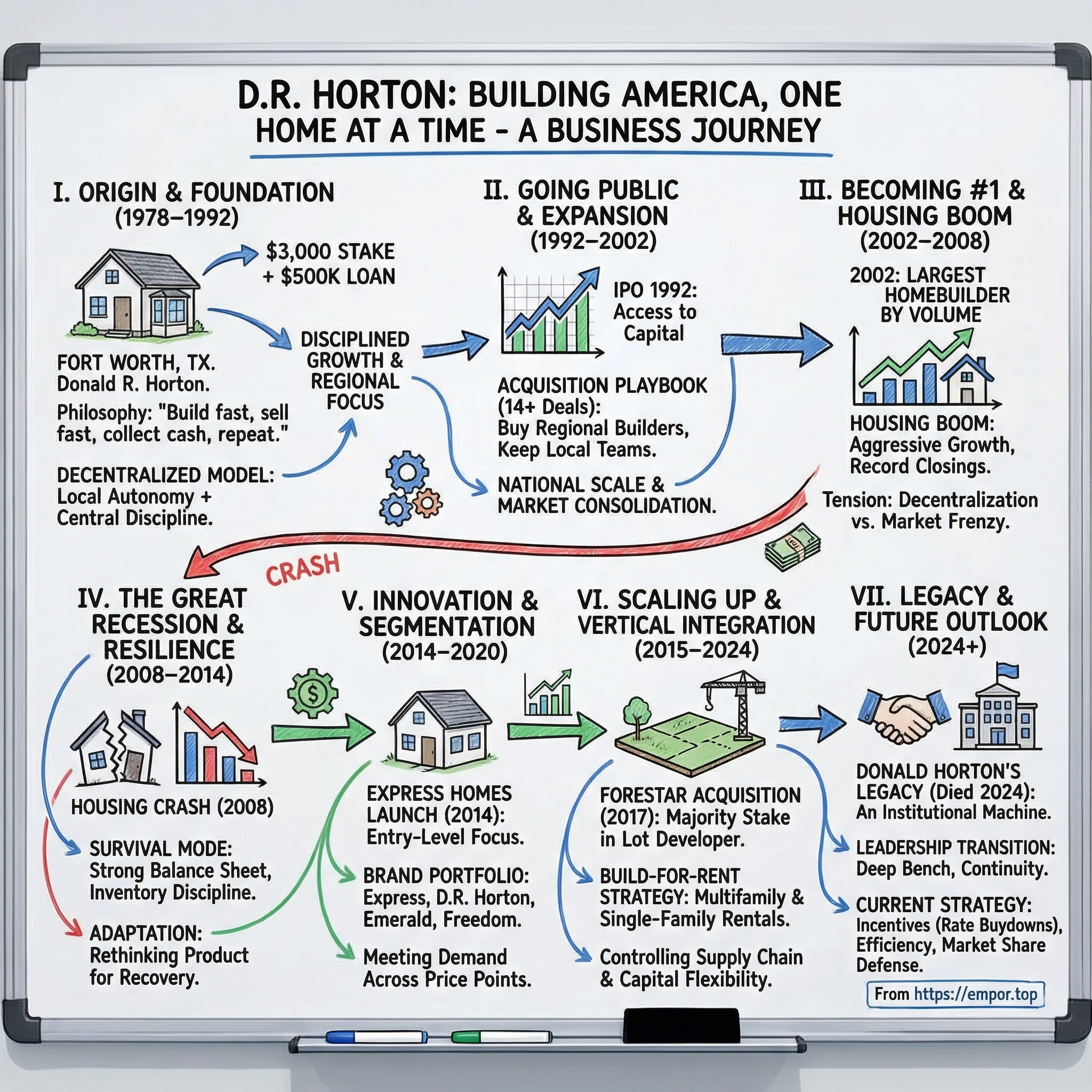 D.R. Horton built a decentralized operating model that gives local teams real autonomy—finding land, designing product, building, and selling—while the center enforces financial discipline and provides the muscle. It developed a portfolio of brands, from entry-level Express Homes to the luxury Emerald line, so it could meet buyers across the income spectrum without reinventing itself every cycle. And it created an acquisition playbook that absorbed regional builders into a national platform without killing the entrepreneurial energy that made them valuable in the first place.