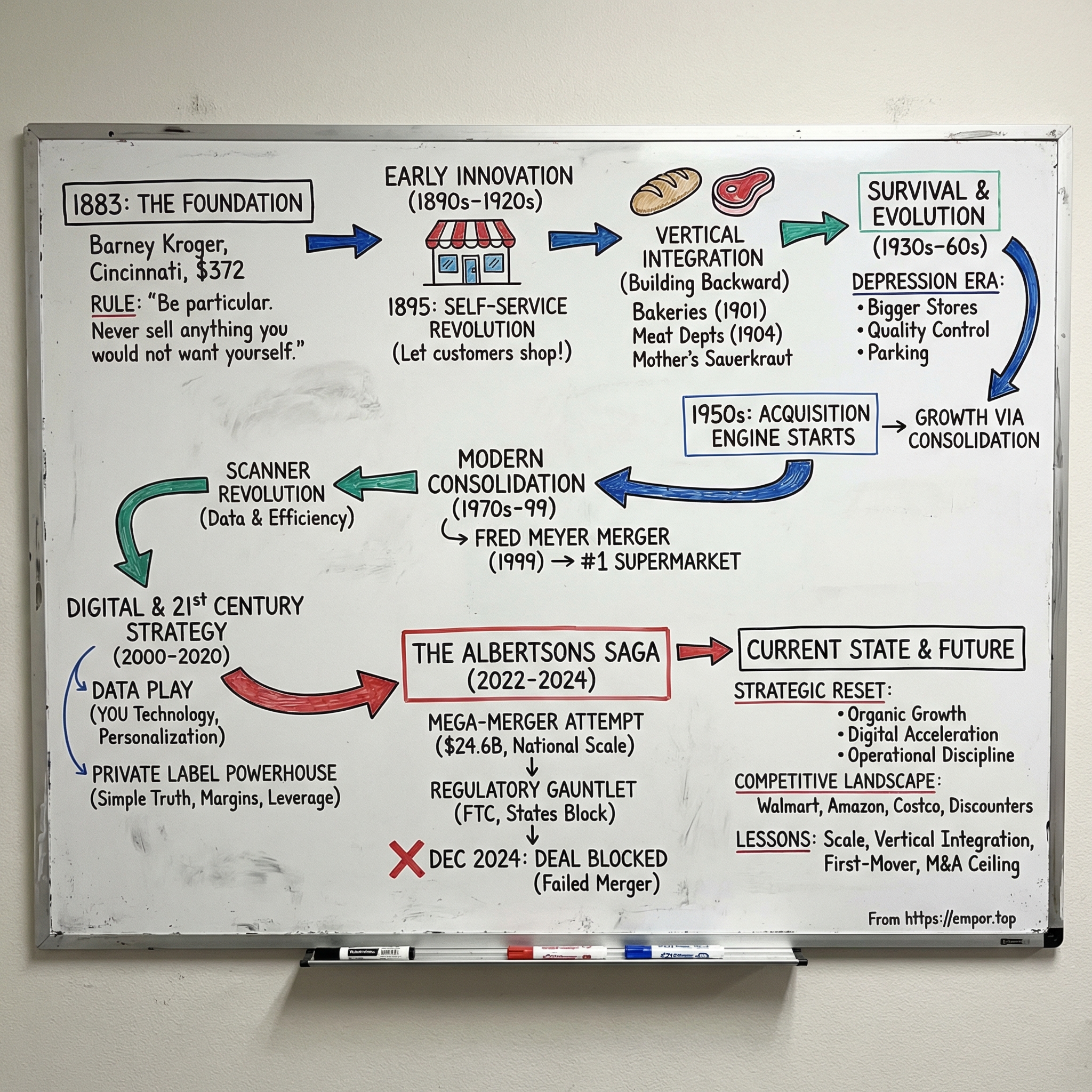 The contrast is staggering. Barney Kroger started with $372 in 1883. The company that grew out of that first storefront became a $150 billion enterprise employing hundreds of thousands of people. And yet the strategic problem looks familiar: how do you keep winning in a business that gives you so little room for mistakes?