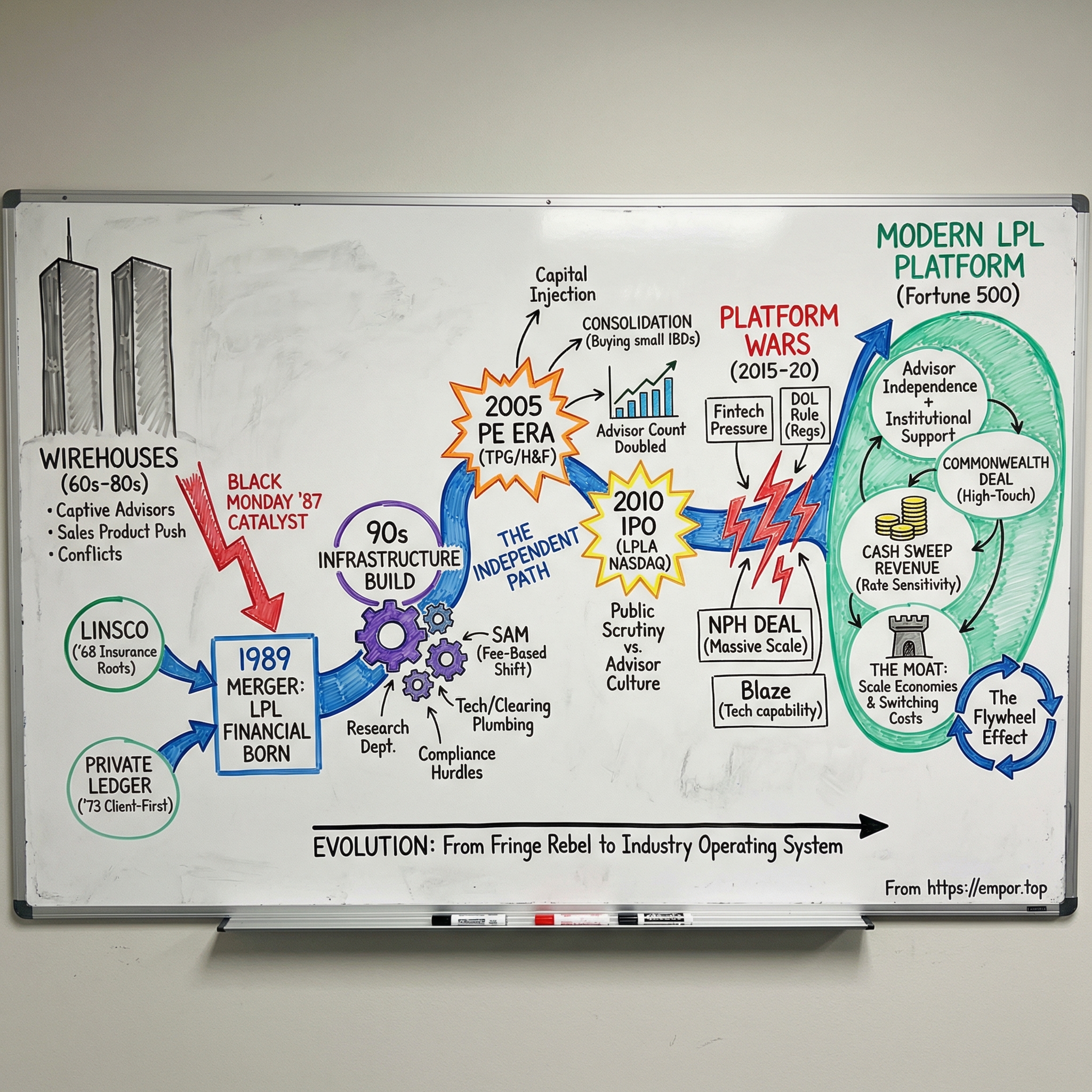 From post-1960s disruption, through the chaos of Black Monday, all the way to Fortune 500 dominance, LPL’s journey reveals something bigger than one company’s success: in financial services, infrastructure eventually beats distribution—and the most powerful revolutions are often the ones built patiently, out of sight.