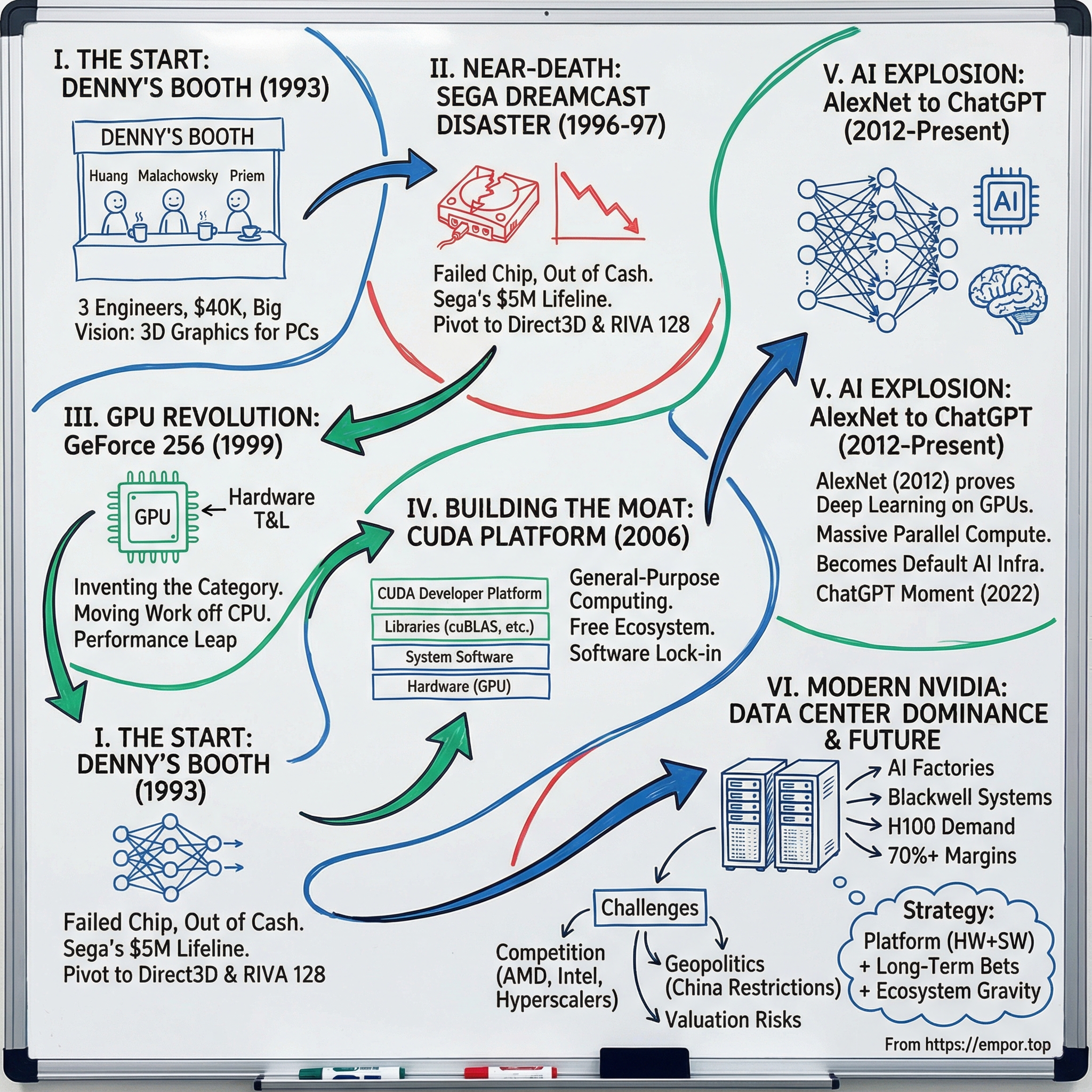 NVIDIAâs rise from a Dennyâs booth to the center of the AI economy isnât just a hardware story. Itâs a strategy story. A handful of choicesâmade early, reinforced under pressure, and compounded over decadesâcreated the flywheel that competitors still canât quite stop.