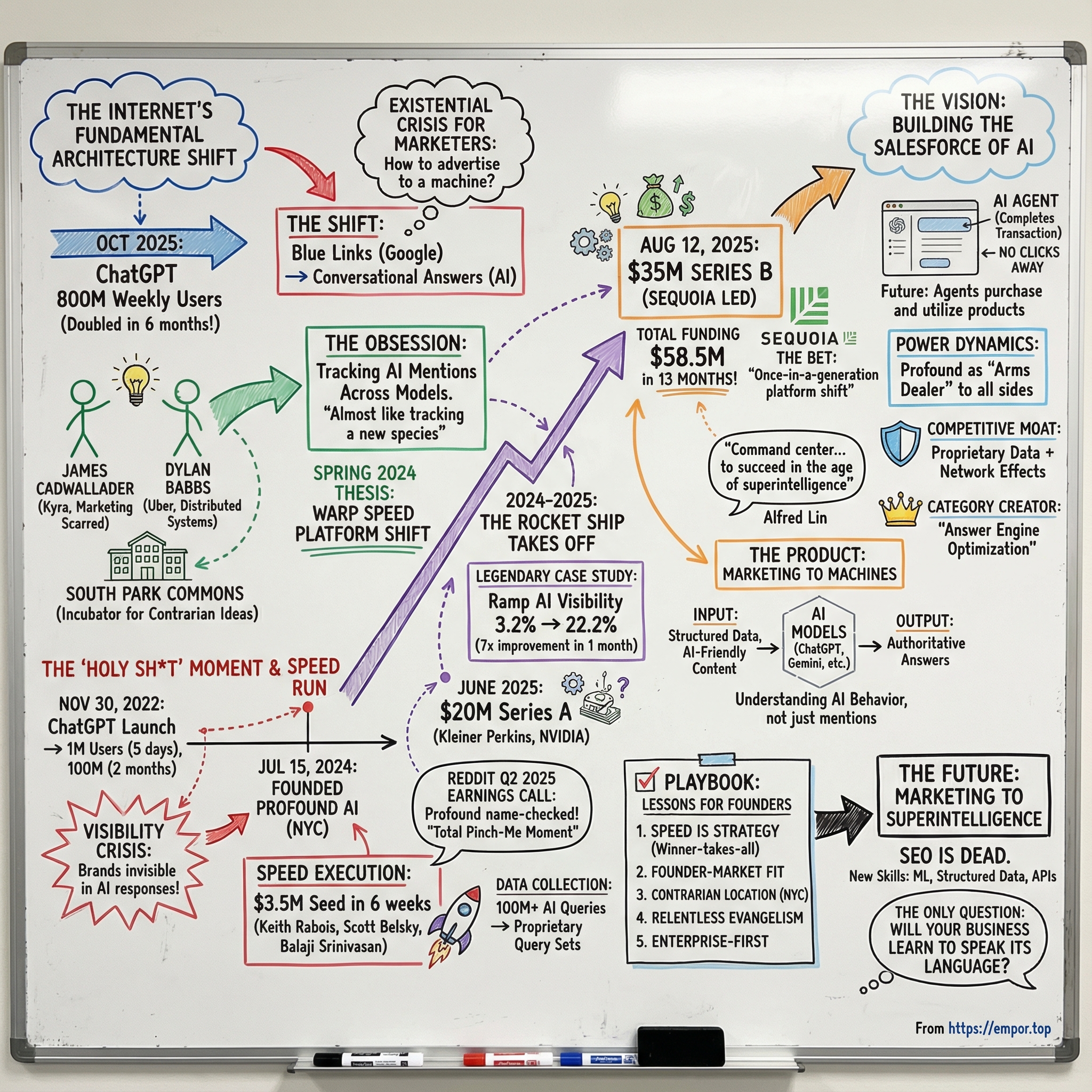 Enter James Cadwallader and Dylan Babbs, two founders who built something remarkable: a company that went from zero to $58.5 million in funding in just over twelve months, addressing a market that literally didn't exist eighteen months ago. Their company, Profound AI, represents perhaps the fastest category creation we've seen in enterprise software—and they did it by recognizing a simple truth: every company on the planet needs to understand and control how AI interprets, talks about, and eventually uses their products.